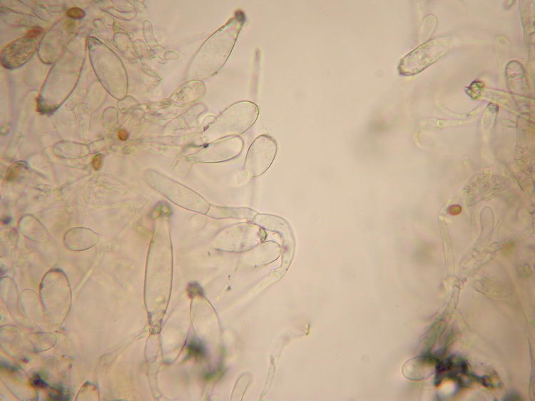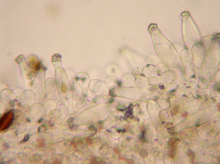 Makroskopisch hätte ich ja auf eine I. rimosa getippt, aber da lag ich daneben. Nun tendiere ich mit viel Bauchschmerzen zu I. fuscidula (Braunstreifiger Risspilz). Sporen und Basidien sind etwas überdimensioniert. I. nitiduscula habe ich wegen der völlig fehlenden Rottöne am Stiel verworfen. Vielleicht hat ja von euch jemand eine bessere Idee.