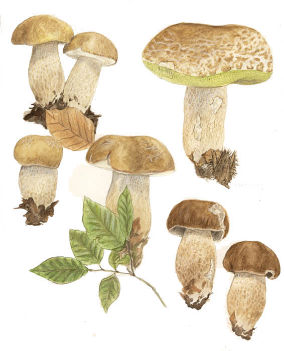 Tanja hat eine wunderschöne (wie ich finde) Tafel von einigen der Exemplare gemalt, wobei die beiden etwas dunkleren rechts von einem anderen Standort als die übrigen stammten. Aber es sind alles Boletus reticulatus.