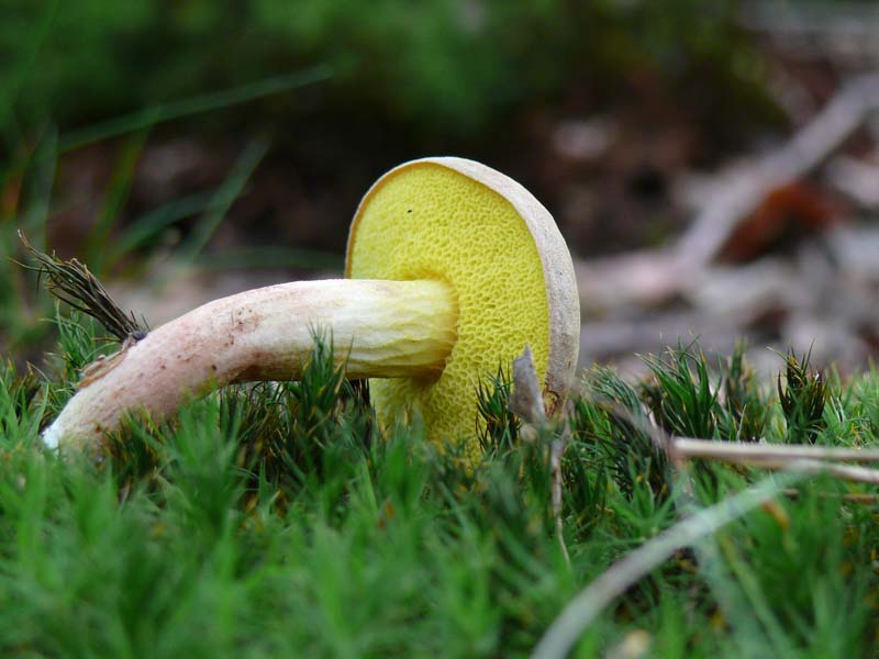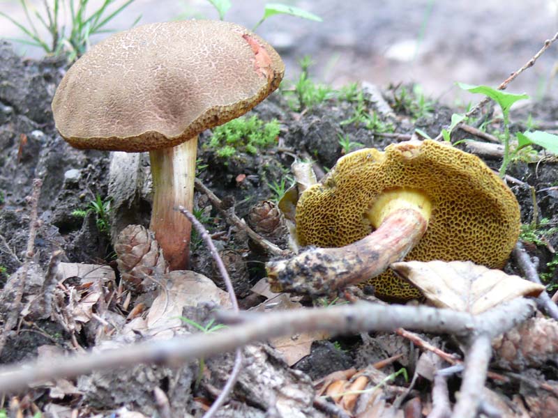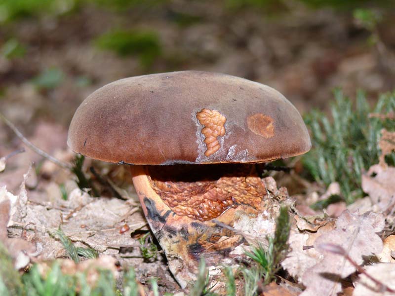 Bronceröhrling (Schwarzhütiger Steinpilz) unter Kiefer in der Nähe von Rotbuchen.
