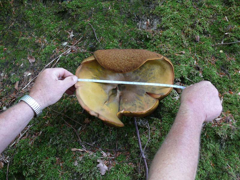 Flockenstielige Hexenröhrlinge, einer davon riesig (27 cm Hutdurchmesser).