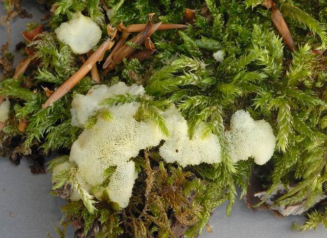 Es wuchs in Dutzenden solcher schwammartigen Kissen auf dem Moos auf einem am Boden liegenden Baumstamm (vermutlich Buche). Aus der Ferne dachte ich erst an einen Schleimpilz (das ist es sicher nicht), aus der Nähe betrachtet ...