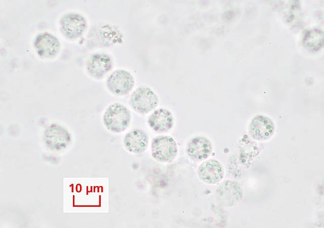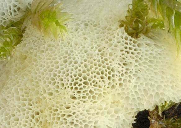 ... fielen mir resupinate Wachsporlinge ein, von denen mir ähnliche Formen aus der Literatur erinnerlich waren (Ceriporia viridans ??? eher nicht). Vielleicht Trechispora mollusca (der schneeweiße Stachelporling)??? Unter dem Mikroskop sieht alles eher zellig als hyphig aus. Basidien habe ich keine gefunden. Vor allem rundliche Zellen mit einem DM von ca. 10 µm:
