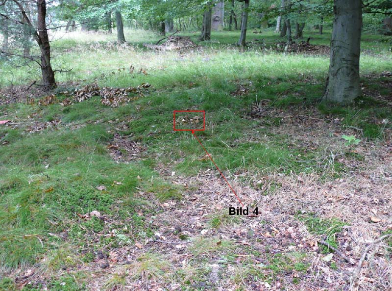 Als erstes, Bild 3, die Fundstelle mit Kennzeichnung des Fundortes der Bronceröhrlinge, wo ich die stattlichen Pilze seit Jahren regelmäßig finde. (und immer wieder die Mistkäfer!)