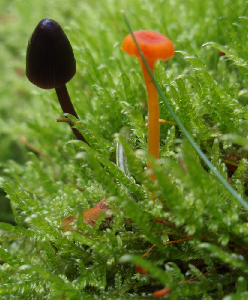 Hallo, war in Trittau (Norddeutschland) in der Hahnheide unterwegs. Da Naturschutzgebiet kein Pilze sammeln, sondern nur gucken und Fotos. Es gab aber auch nur Mini-Pilze. Diese beiden scheinen sich zu lieben, aber kaum zueinander zu finden. Ich kenne weder den/die eine(n) oder andere(n). Hutgröße maximal 0,5 cm, Fichten-Mischwald moosiger Grund.