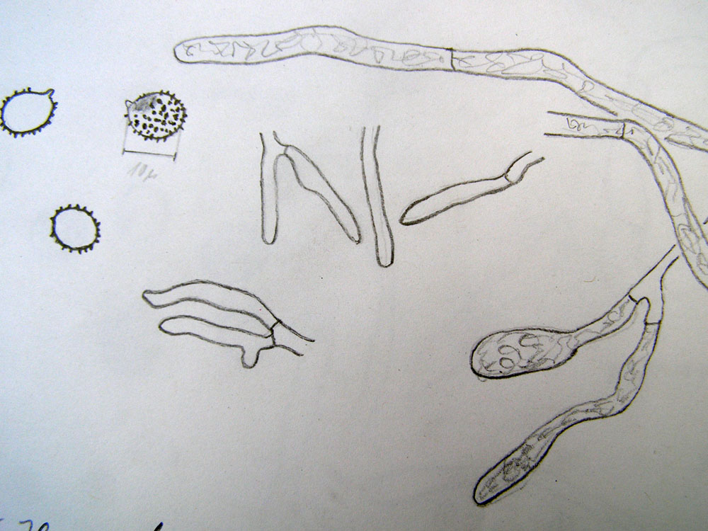 das ist es etwa, was ich mit dem Zeichenspiegel zuwege bringe. Zeitaufwand 30 - 45 min, allerdings ohne Herstellen eines vernünftigen Präparats. Ohne einen Zeitvorrat von mindestens einer Stunde fange ich mit dem Mikroskopieren gar nicht erst an. Eins ist Russula laeta/borealis ohne gezeichnete Inkrustrationen, zwei nach meinen Berechnungen Russula alutacea.