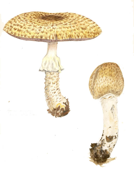 : Gruß Roland Hallo, sicher kein Riesen-Champignon, der einen angedrückt-schuppigen Hut hat und ebenso einen recht deutlich schuppigen Stiel. Letzte Woche im Kurs hatten wir ein schönes Exemplar vom Riesen-Champignon, den Tanja gemalt hat:
