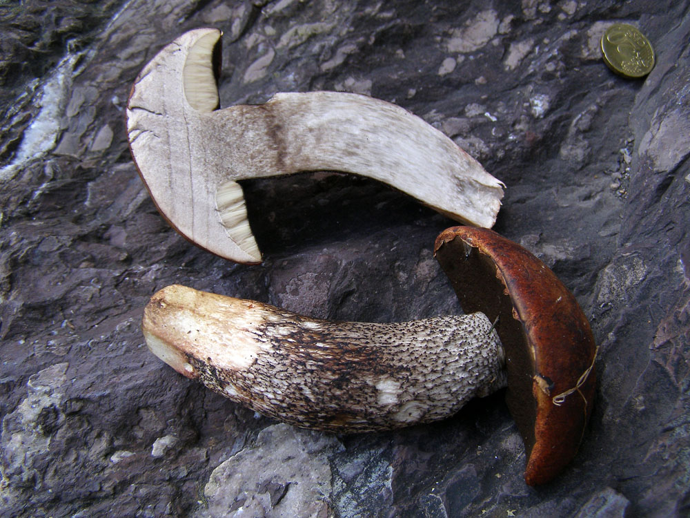 Mit dem schwärzenden, partiell rötenden Fleisch, der überhängenden Huthaut, rotbraunem Hut sind sicher gute Bestimmungsmerkmale gegeben. Mich verwirren die dunklen Röhren, aber vielleicht ist das ja auch normal. Also bitte eine Bildbestimmung.