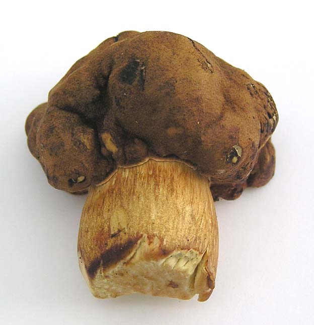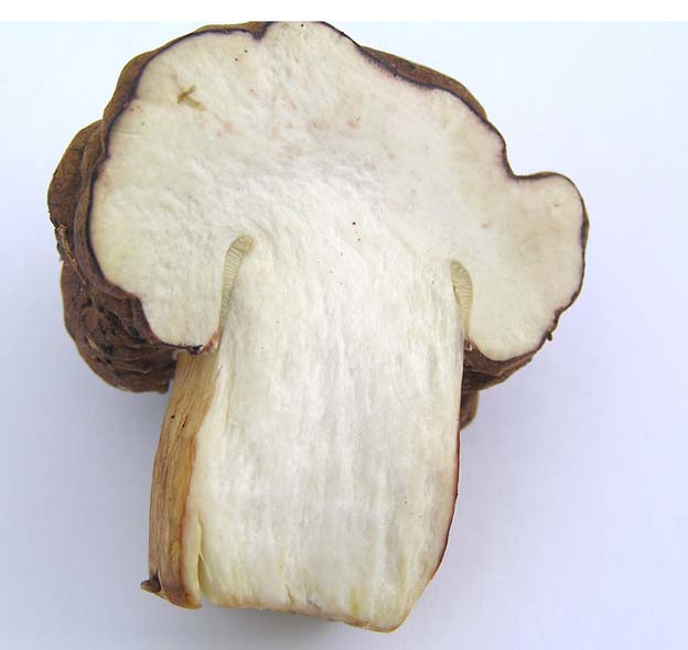 Höhe etwa 4 cm., Hut samtig/filzig. Das Fleisch wird nach dem Anschneiden schwach gelb, nach einigen Minuten cremeweiß. Bei Druck nur ein ganz vager bläulicher Schimmer, also eigentlich kein Blauen. (Anschnitt nach einem Tag leicht ockerbräunlich) Fleisch kompakt, fest. Röhren sehr kurz, weißlich. Geruch pilzig, Geschmack angenehm, nach längerem Kauen eine leicht Schärfe an der Zungenspitze. Es wuchsen wohl noch mehrere Exemplare mit deformiertem Hut um eine Kiefer herum, leider hat der Pilzesammler nur dieses junge Exemplar mitgebracht.