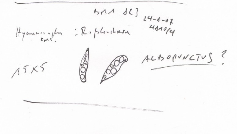 aber im ernst: hier mal eine frage an die ascomyceten-freunde unter uns. vor ein paar tagen fand ich eine hymenoscyphus-art an vorjährigen blattstengeln von rosskastanie, geradezu ein massenvorkommen, der ganze boden war übersät davon. apothezien weiß 0,1-0,3cm, deutlich gestielt, bis 0,2cm hoch, rötungen nicht beobachtet, ocker eintrocknend. unterm mikroskop zeigten sich sehr auffällige sporen wie ich sie vorher noch bei keiner anderen hymenoscyphus-art hatte: ein ende extrem zugespitzt, das andere wulstig verbogen, viele große und mittlere öltropfen (siehe notiz). nun finde ich im ellis den hinweis auf h. albopunctus bei rosskastanie, wo tatsächlich verbogene sporenenden abgebildet sind. im aktuellen gattungs-schhlüssel von declerq finde ich albopunctus jedoch nicht wieder (blind?). kennt jemand die art?