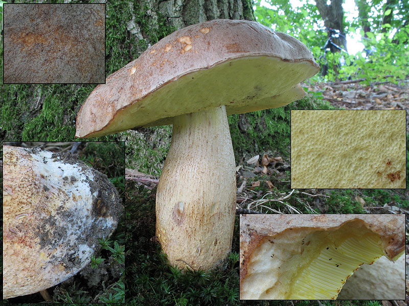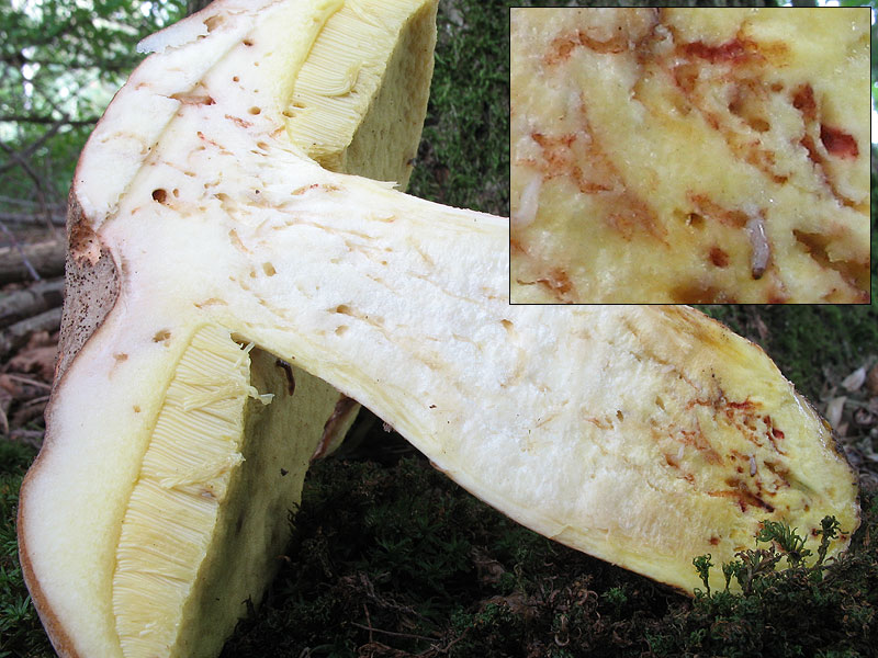Unten der Querschnitt, Fleisch in der Basis gelb, Madengänge karmin-rot. Stiel eigentlich ohne/oder kaum Netz...Fleisch nicht blau anlaufend.
