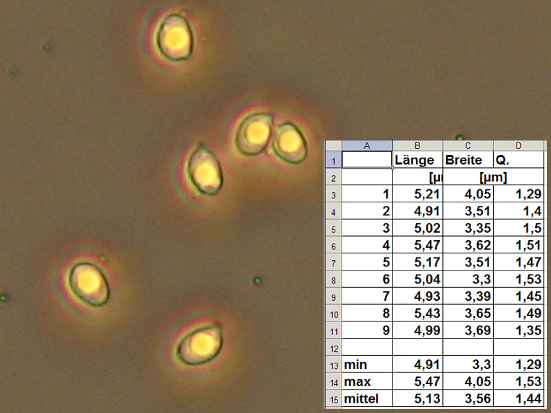 Zystiden habe ich keine gefunden. Unten Sporen, hyalin, mit Tropfen, klein : ca. 5,1x3,6µm