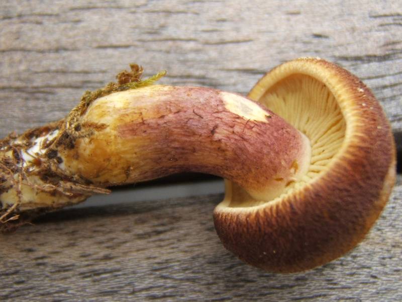 Hallo zusammen, hier ein Pilz, der mich am ehesten an einen rötlichen Holzritterling (Tricholomopsis rutilans) erinnert, aber da bin ich mir alles andere als sicher. Wenn es ein rötlicher Holzritterling sein sollte, wäre er dafür ziemlich klein - der Hutdurchmesser beträgt gerade mal 2 cm (allerdings ist er ja auch noch ziemlich jung). Leider war er ein Einzelgänger, ich habe also keine älteren Vergleichsexemplare. Er wuchs auf einem alten Baumstumpf, aber fragt mich bloß nicht, welches Holz das war... Die Huthaut sieht filzig aus und fühlt sich auch so an. Riechen tut er nicht auffällig, probiert hab ich den Winzling nicht. Der Stiel ist oben rötlich und wird nach unten hin immer gelber. Ansonsten kann ich eigentlich nicht viel erzählen, was man nicht auch auf den Fotos sieht. Was meint ihr zu dem Pilz? Viele Grüße
