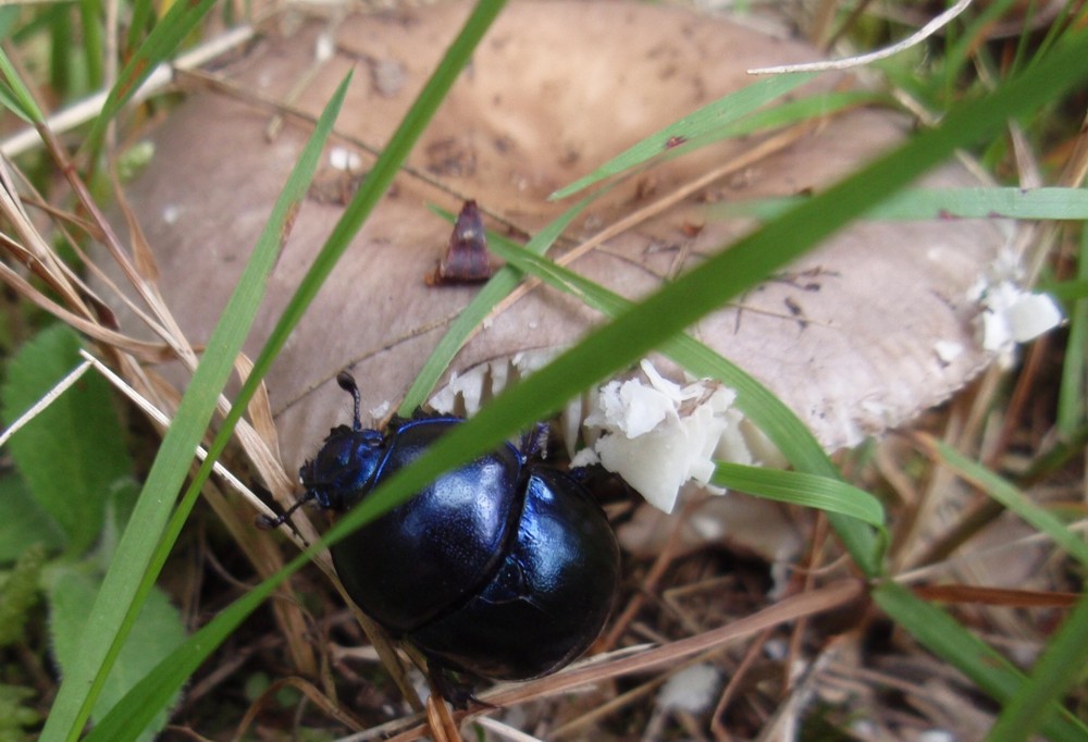 und dann noch ein ganz hungriger Pilzfreund, der Waldmistkäfer, der noch schneller als jede Schnecke frißt - das Teilstück war weg, während ich die Aufnahme machte.