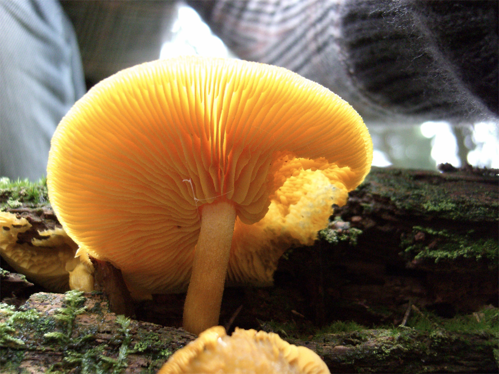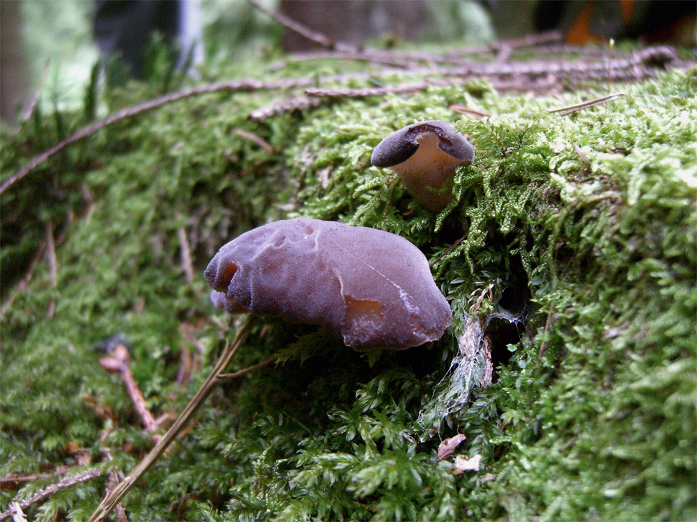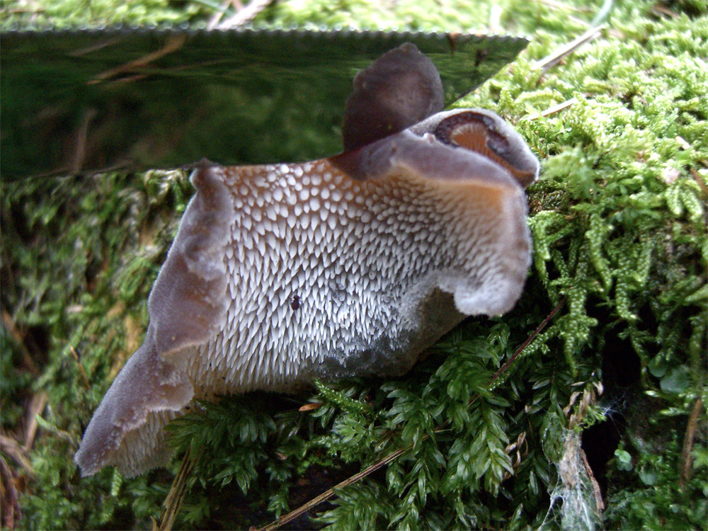 hier dachten wir zuerst an ein judasohr, doch dann sahen wir die stacheln unter dem hut... ist das vielleicht ein zitterzahn, pseudohydnum gelatinosum?
