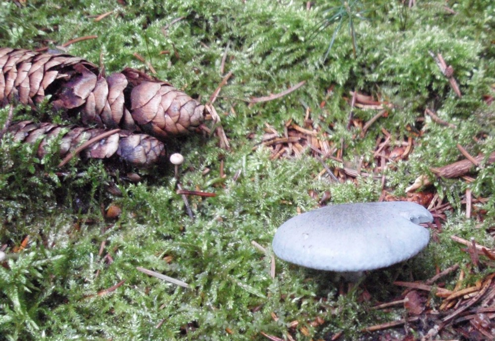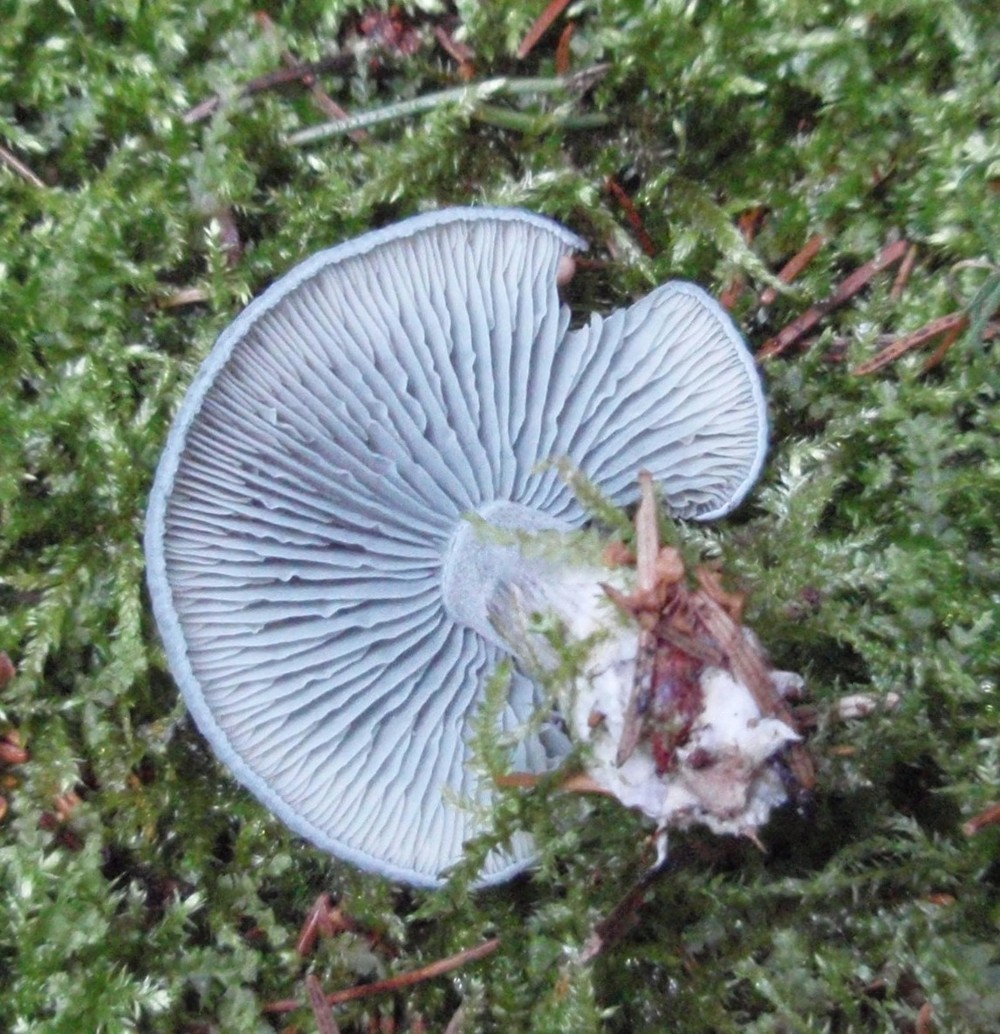 ich fand heute im Nordost-Osten Hamburgs im überwiegenden Fichtenteil des Waldes zwei dieser blauen Pilze. Die Farbe ist meiner Meinung nach recht natürlich und erscheint mir jetzt nach einiger Zeit später als stahlblau. Der Pilz hat vollständig diese Farbe, Hut, Lamellen, Stiel. Das Fleisch ist weiß, nimmt aber im Anschnitt bald vom Rand her ebenfalls diese Farbe an.