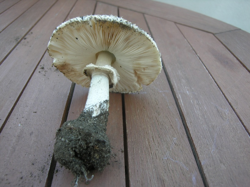 Die jungen, kleinen Pilze haben einen recht feuchten, dunklen Hut. Die Pilze sind gruppenweise an den Knollen miteinander verwachsen. Habe heute leider keinen Pilz mit einer Scheide sehen können, aber laut Schwiegermama wachsen sie aus einer Scheide heraus.