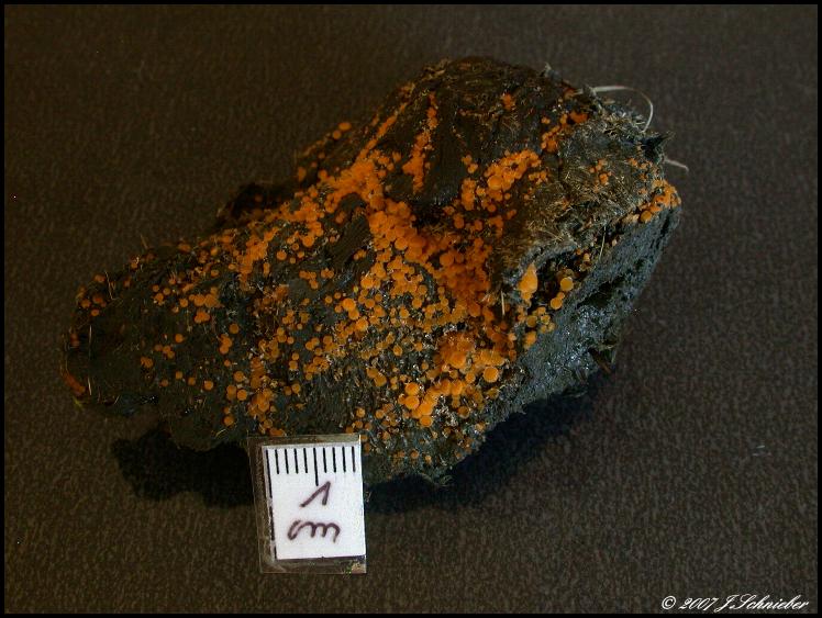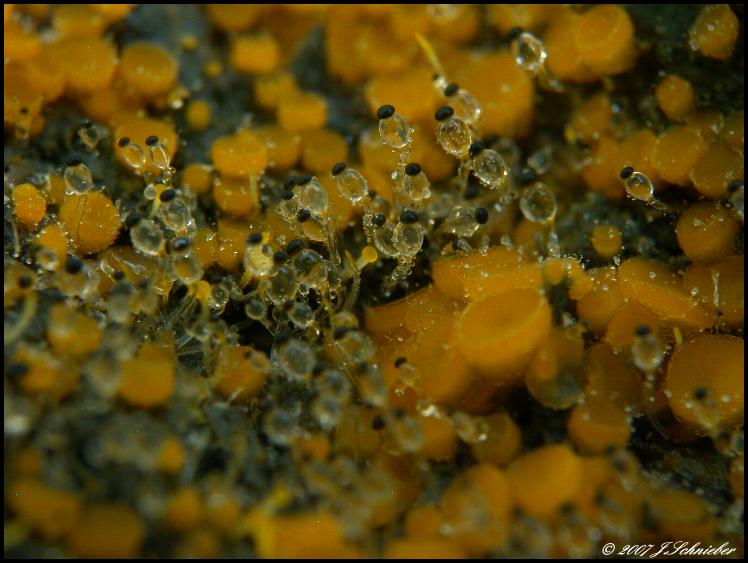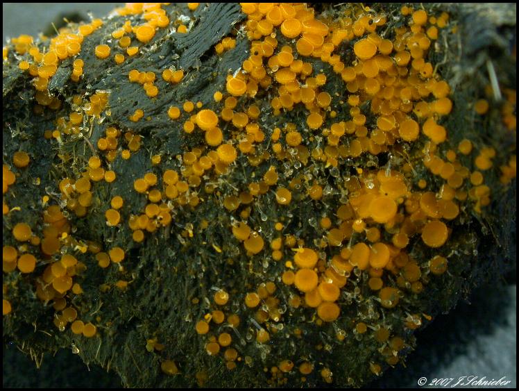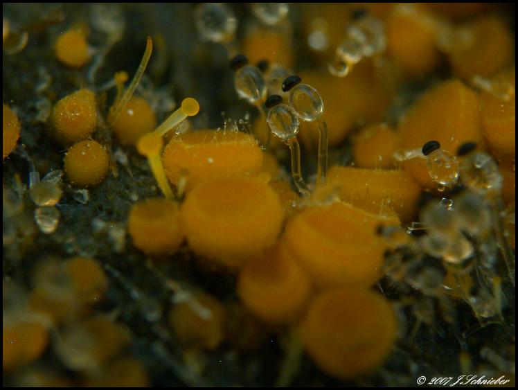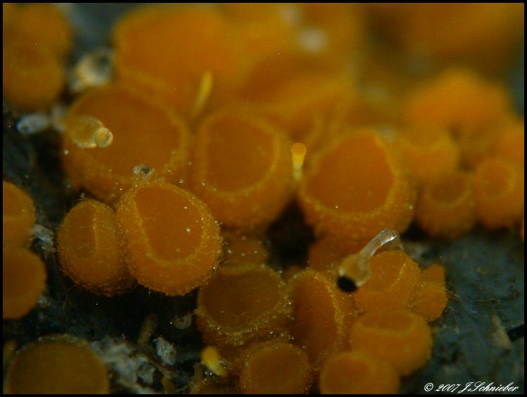 Bein genaueren Hinsehen entpuppten sich die orangen Punke als kleine Becherlinge unbekannter Art.