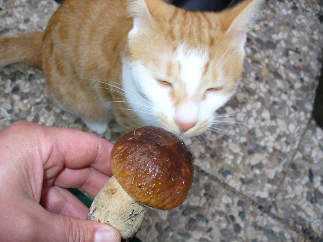 Hallo, hier ein Bild meiner "Trüffelkatze". Ist ein Kater und liebt gebratene Pilze ! Wenn das mit dem Bild klappt habe ich demnächst ein paar Fragen. Habe in Schleswig-Holstein eventuell Tricholoma equestre gefunden. War völlig überrascht, bin mir aber nicht 100% sicher. Natürlich lasse ich sie stehen, sind ja geschützt ! Aber die Freude war natürlich groß ! Pilze zu finden ist hier nicht so einfach wie im Süden. Die wenigen Wälder sind völlig überrannt und die Wiesen mit trampeldem Vieh bevölkert. Die Hauptnahrung eines Norddeutschen Pilzsammlers besteht deshalb aus Schopftintlingen - aber man kennt seine Ecken mit Röhrlingen und Täublingen, Bovisten und Krausen Glucken....! Und (das Gute !) Dänemark ist nicht weit...und die Dänen haben Wald und essen keine Pilze aus dem "Skov" (Wald), das macht sie noch sympathischer als sie ohnehin schon sind !