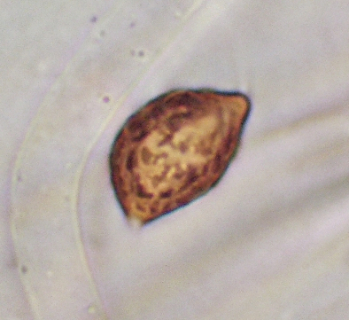 : Hallo zusammen, : anbei noch einem Sporenbild von meinem Schleierling. : Viele Grüße : Wolfgang Hallo Wolfgang, die Sporenform auf deinem Mikrofoto gilt in Cortinarienkreisen als mandelförmig. Zitronenförmige Sporen haben das apikale Ende deutlich abgesetzt. Damit spricht die Sporenform ebenfalls für C. luhmannii. Toller Fund! Habe mal versucht ein Foto eine zitronenförmigen Spore anzuhängen (C. elegantissimus). Bin gespannt, ob das klappt. Gruß