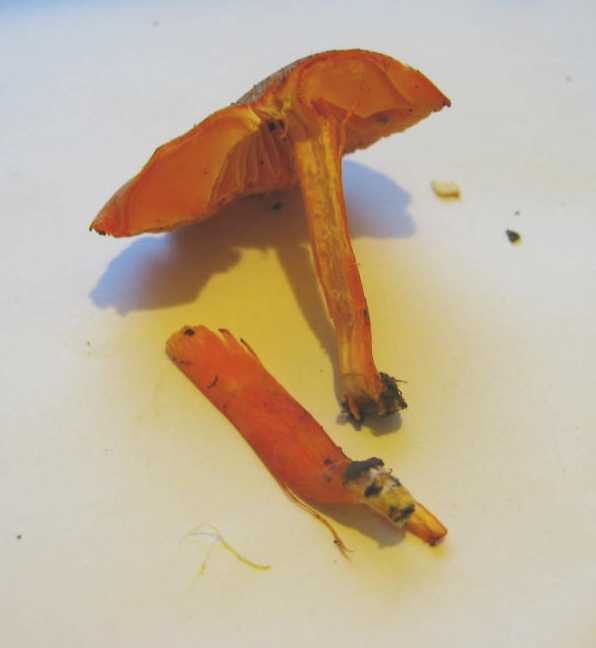 dieser pilz (unten) war eindeutig als Rötlicher Lacktrichterling identifiziert, als ich nochmals rumblätterte und den kirschroten saftling fand. Problem hier: der saftling hatt angewachsene lamellen, meiner nicht. Aber der stiel sieht dem viel ähnlicher, wenn meiner auch dünner ist. Auf meinen Bildern ist der stiel des lacktrichterlings eher rauh und gerieft, meiner ist aber rot und glatt, das fleisch des stiels ebenfalls sehr gelb/weiß... Hmmm.