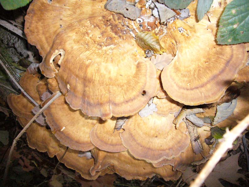 1.) das Ähnlichste, was ich in meinem Pilzbuch finde, ist ein Schwefelporling. Aber auf den Fotos im Netz und im Buch ist er viel farbiger, leuchtender. Was kommt denn da noch in Frage?