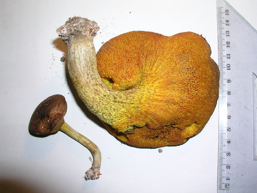 Hallo an alle, folgenden Suillus hat mir ein Freund heute zur Bestimmung vorgelegt, aber ich bin ratlos: Fundort unter fünfnadeliger Kiefer, vermutlich P. strobus, angepflanzt in einem Garten in der Pfalz. Röhren relativ weitporig, herablaufend. Die Poren sind feuerrot, aber das scheint auf eine Infektion zurückzugehen. Die Huthaut ist rötlich (leicht violettlich) braun und ohne jede faserige oder schuppige Struktur. Der Siel zeigt grobe schwärzlichbraune Flecken von den Drüsenpunkten. Spitze leuchtend gelb, zur Basis weißlich. Basalmycel rosa. Irgendwie irre ich bei der Bestimmung um collinitus herum, kann mich aber mit der Bestimung nicht so recht anfreunden. Leider ist der Großteil schon bei den Eltern des Freundes in die Pfanne gewandert, und ich habe nur zwei "alte Schlappen". Grüße, Wolfgang Prüfert