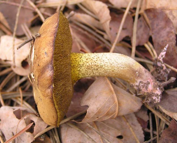 Man sieht deutlich die rosa Basis, der Stiel hat immer schuppige Punkte (nicht immer so dunkel) und die Porenfarbe beim alten Pilz (jung hellgelb, Fleisch auch hellgelb) ist ganz anders als bei deinem Fund. Welcher Baum kommt den als Mykorrhiza-Partner in Frage? Liebe Grüße