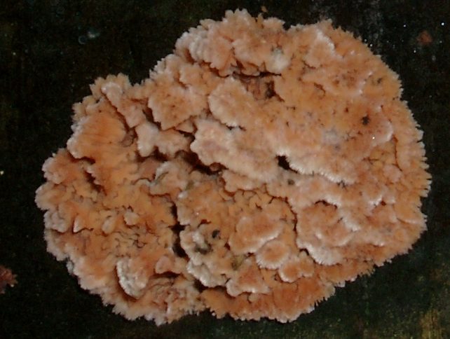 Hallo Dirk, diese faltigen Strukturen gibt's ja auf dem Foto im mittleren Bereich auch, aber für Merulius tremellosus würde ich den Pilz nicht halten. Ich habe hier noch einmal einen jungen ca. 1,5 cm großen Pilz (Ausschnitt vom selben Foto). Dann bleibt es wohl bei Phlebia radiata. schöne Grüße Andreas