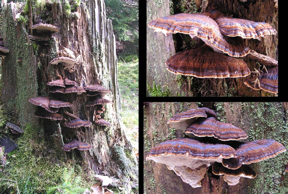 Hallo, anbei mal Bilder von I. benzoinum, dem Gebänderten Harzporling von Fichtenstubben. Die Aufnahme stammt von Mitte Oktober, also zu einer zeit als die Art längst in ihrer verhärtete Phase war. Die Bilder von Robin sind sicherlich früher im Jahr aufgenommen worden und zeigen die Art (I. benzoinum) in der weichen Phase. Diese zwei verschiedenen Wuchsphasen sind meines Wissens Gattungsmerkmal von Ischnoderma und nur da zu finden. beste Grüße,