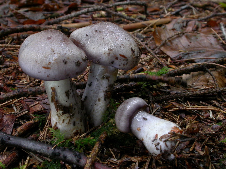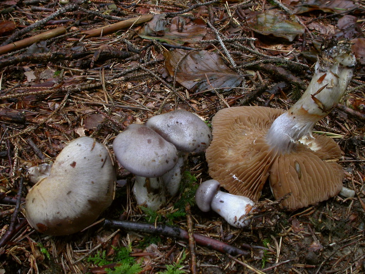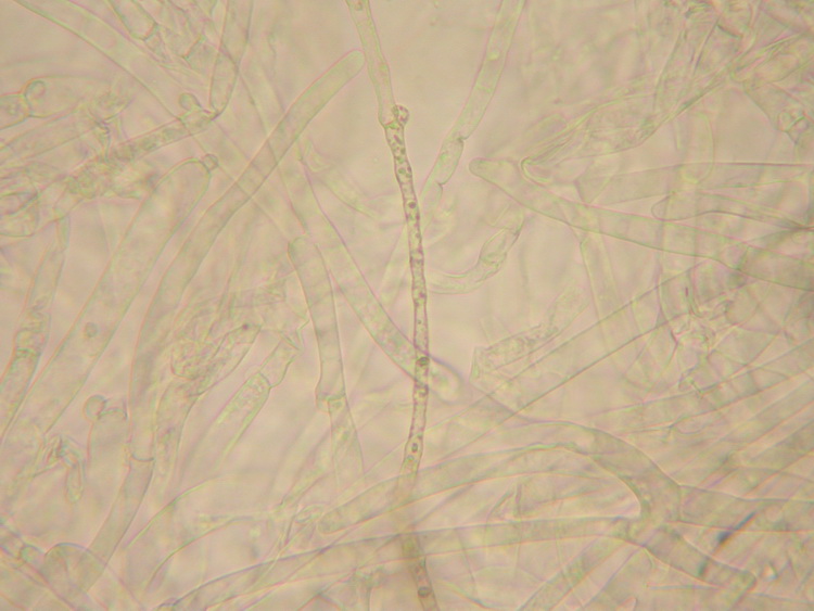 Funddaten: 08.09.2007; Fundort: MTB 8034/4/1/4, 600 m, Puppling, bei Fichte, Buche und (weiter entfernt) Kiefer; gesellig; Hut: bis 6,5 cm breit, konvex, stark schleimig, glatt, besonders am Rand eingewachsen faserig, Hutfärbung durch hellgraues Velum (?) insgesammt sehr blass, am Scheitel und stellenweise auch zum Rand hin rötlich braun (hier fehlt der graue Belag), sonst lilagrau, am Rand intensiver lila gefärbt, alt vom Scheitel her ockerlich ausblassend; Hutrand bei jungen Fk deutlich durch vom Schleim überzogene Cortina mit dem Stiel verbunden; Stiel: bis 6 x 2 cm, keulig, basal spitz zulaufend (Basis insgesamt also spindelig), alt hohl, direkt an der keuligen Basis trocken, darüber bis zu einer deutlichen Ringzone schleimig, lilagrau, Velumbelag an und überhalb der Basis hellgrau und ockerlich umfärbend, Stielspitze über der Ringzone blass lilagrau; Lamellen: breit angewachsen, mäßig gedrängt bis entfernt, jung lilabraun, später hellbraun, alt rostbraun, Schneiden glatt und gleichfarbig, bei sehr jungen Fk heller abgesetzt; Fleisch: schmutzig cremefarben, in der Stielspitze lilagrau, in der Basis cremeocker, über den Lamellen praktisch bis zur Huthaut wässerig braun; Geruch: aromatisch-pilzig; Geschmack: mild, fad; Chemie: -; Velum: Hyphen des Stielvelums: mit Schnallen, einzelne Hyphen inkrustiert (siehe Fotos); HDS: Epicutis aus ca. 5 µm breiten Zellen, Septen mit Schnallen, oberste Hyphen meist inkrustiert wie manche Stielvelumzellen; Basidien: -; Sporen: rundlich, dicht und ziemlich grob warzig, 7,2 x 6 (6,5-8 x 5,5-6,5), Q=1, 2 (1,2-1,3)
