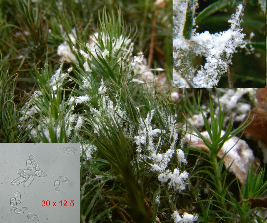 Hallo Forum, also, der Aufforderung von Ingo komme ich gerne nach, allerdings stelle ich dann doch etwas ein, was mir bislang rätselhaft blieb. Es handelt sich um einen weißen "flockigen" Überzug auf Moos, den ich jedes Jahr an derselben Stelle finde. Der flockige Überzug geht dabei auch auf Blätter und Steine über. Ich bin mir nicht einmal sicher, ob es sich dabei um einen Pilz handelt - und wenn ja, dann ist er vermutlich nicht bei den Basidiomyceten oder Ascomyceten zu finden (es sei denn es handelt sich um eine anamorphe Form). Hat jemand vielleicht zu folgendem Fund (s. Foto) eine Idee? Zahlenangaben auf dem Mikrofoto bezeichnen die durchschnittliche Größe der "Sporen".