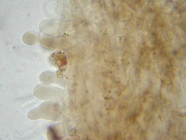 Funddaten: 15.07.2007; MTB 8136/4/3/1, 720 m, Taubenberg, an einer schottrigen, steinigen Böschung, teils direkt Steinen aufsitzend; bei Fichte, jungen Buchen und (weiter entfernt) Tanne; gesellig (ca. 5 Fk); Hut: 1,5 bis 2,5 cm breit, stumpf gebuckelt, Oberfläche radial faltig-furchig, matt, schokoladenbraun, zum Rand hin etwas heller, bis zum Scheitel durchscheinend gerieft; Stiel: 1,5-4 cm lang, bis 0,4 cm breit, zylindrisch, basal kaum bis schwach verdickt, blass graubraun, häufig etwas verdreht, auf ganzer länger +/- ausgeprägt bereift, Reifpünktchen bräunlich; Lamellen: entfernt, untermischt, am Stiel ziemlich breit angewachsen, sehr bauchig und deswegen am Stiel steil aufsteigend, ziemlich dick (an Hygrocybe erinnernd), grau bis graubraun; Schneiden glatt, ab un zu etwas gekerbt; Fleisch: im Hut grauweißlich, im Stiel wässerig graubraun; Geruch: schwach, uncharakteristisch; Geschmack: mild, neutral; Hymenialzystiden: zylindrisch bis spindelig-bauchig, Cheilos locker auf der Schneide verteilt, Pleuros häufig (wie bei Inocyben), voluminös, aber dünnwandig, ca. 55-80 x 12-17; Pleurozystiden: siehe Hymenialzystiden; Kaulozystiden: weniger voluminös als die Hymenialzystiden, meist schlankkeulig, z.B. 45-55 x 8-10, teilweise auch viel kleiner, sehr variabel, häufig, aber nicht immer intrazellulär braun pigmentiert; HDS: Cutis aus parallel liegenden, 2-10 µm breiten, häufig braun quergetreift inkrustierten Zellen, aus dieser Schicht entspringen zahlreiche keulig-blasige und utriforme, aufgerichtete und hervorstehende, teilweise auch nur ausgestülpte Elemente, die intrazellulär, seltener auch quergestreift inkrustiert braun pigmentiert sind und bisweilen eine zellige Oberfläche bilden, Maße der "Pileozystiden" ca. 30-40 x 12-20, breite der Cutishyphen ca. 2-10 µm, Schnallen sehr groß und zahlreich; Basidien: 4-sporig, z.B. 28x8; Sporen: hyalin, meist ellipsoid mit großem Apiculus, deutlich amyloid, 7,6 x 5 (6,5-9 x 4,5-5,5), Q=1,53 (1,3-1,8);