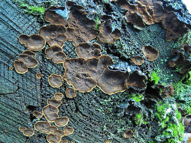 Um Pilze an Holz habe ich bis jetzt meist einen Bogen gemacht, aber in dieser Jahreszeit bietet es sich ja an, auch mal in diesen Bereich einzusteigen. Nachfolgenden Pilz habe ich gestern an der Schnittfläche eines nicht mehr bestimmbaren Laubbaums fotografiert. Ich denke, es könnte Hymenochaete tabacina (Tabakbrauner Borstenscheibling) sein. Gibt es Einwände?