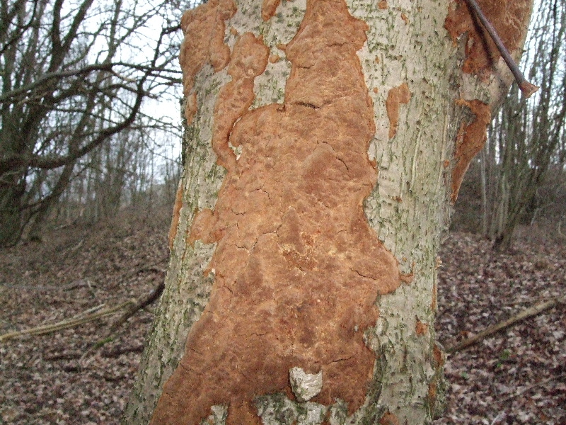 Dieser harte Belag wuchs meterlang an einem stehenden toten Laubholzstamm (wohl Esche), aber auch an gefallenen Ästen am Boden. Ich habe mich spontan in Phellinus ferruginosus verliebt - mag das hinkommen?