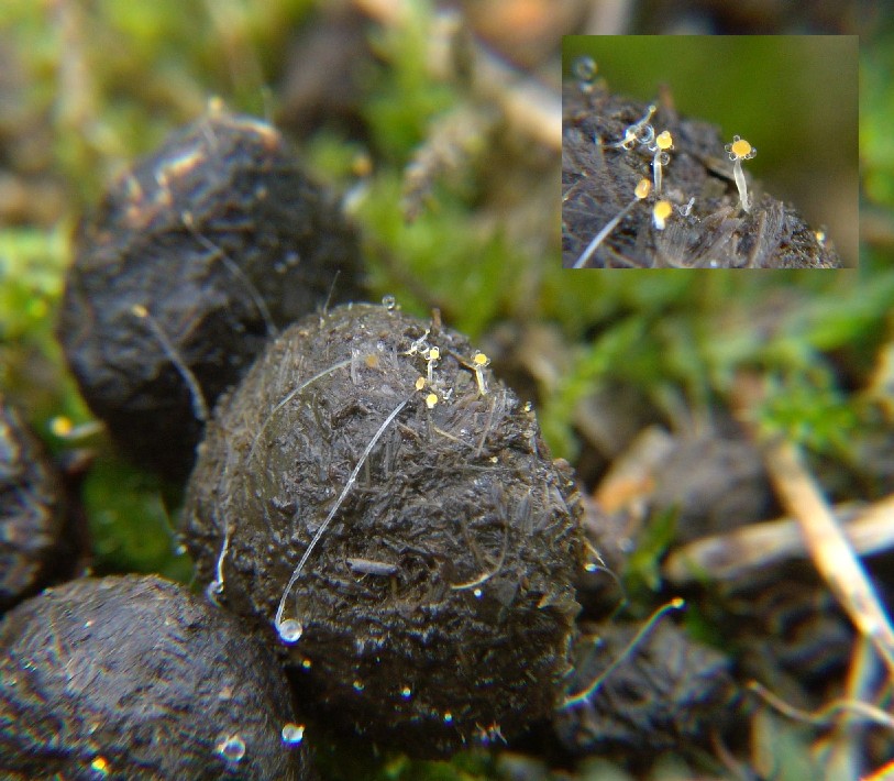 also, meines Erachtens gehört das in die Mucor-Ecke. Deren Köpfchen sind erst hyalin, dann gelb, dann schwarz und man findet sie häufig auf Dung (Pferdeäpfel oder Häselköttel (s. Bild) wären "klass." Substrate). Meines Wissens gibt es da aber eine ganze Reihe von Arten...