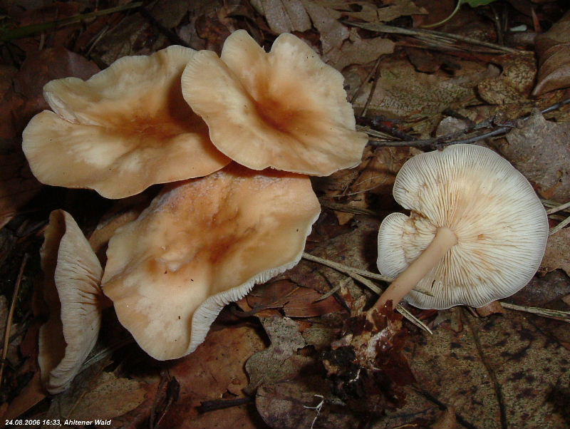 Hallo allerseits, diese Ex. meine ich auf Gymnopus hariolorum und Gymnopus dryophilus eingrenzen zu können. Gegen ersteren würde wahrscheinlich der wenig striegelige Stiel sprechen (falls das überhaupt welche sind im unteren Bereich), farblich gefällt der mir aber sehr gut, wenn man der Abb. im Gerhardt Pilzführer Glauben schenken darf. Für Gymnopus dryophilus würde schon allein die Häufigkeit sprechen, aber mich irritieren die unterschiedlichen Angaben zur Hutrandriefung (nicht, gewöhnlich nicht, mindestens bis zur Hutmitte), ich sehe hier nur eine deutliche, aber begrenzte Riefung am Hutrand. Farblich gefällt er mir nicht so gut, aber ich kenne mit Sicherheit nicht die gesamte Farbpalette von feucht bis trocken. Die gezeigten Pilze waren halbfeucht oder halbtrocken, ganz wie Ihr es wollt ;) Wer entwirrt mich? Niedersachsen, Hannover/Umg., Ende August 2006. Viele Grüße,