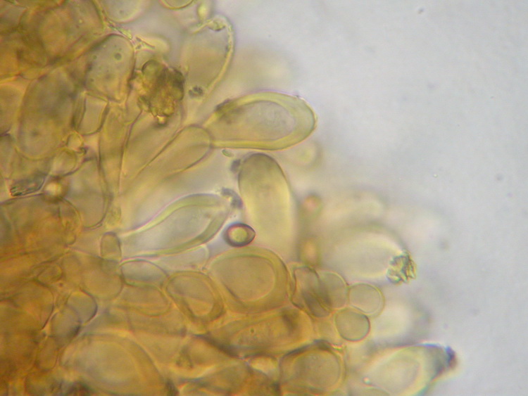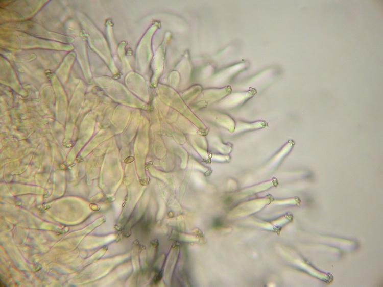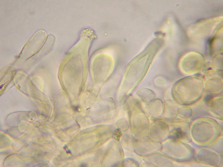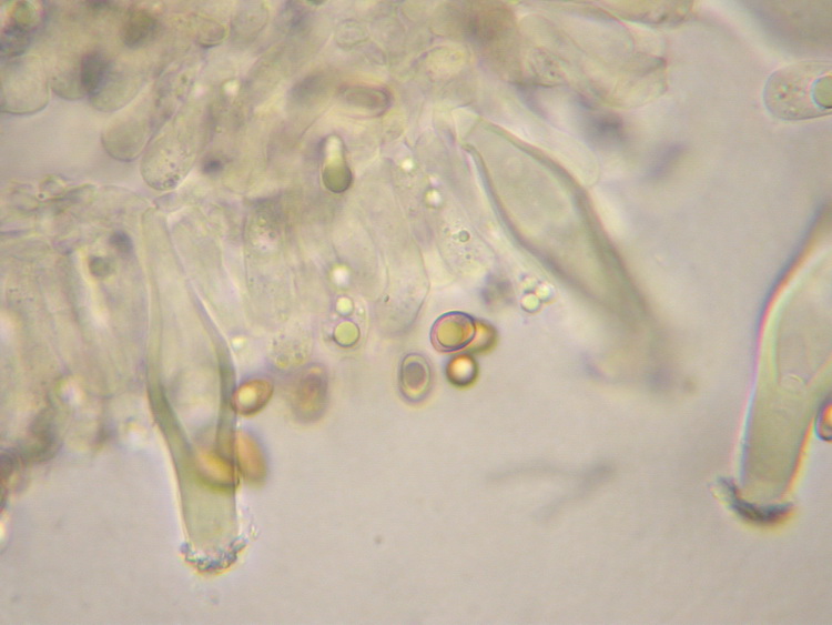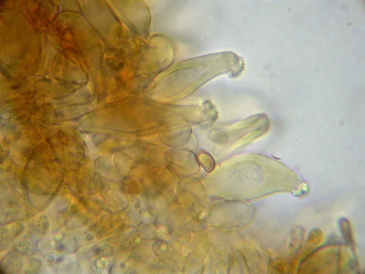 Funddaten: 02.10.2007; Pratomagno,ca. 1300 m, (trockener, südostexponierter Standort) bei Tanne und Buche; gesellig; Hut: bis 5,8 cm breit, grobschuppig aufgesprungen, am Rand grob faserig; keine Cortina festgestellt; Stiel: kompakt, oft breit gedrückt, Spitze erweitert, bis unter die Mitte bereift, Spitze oft längsrillig, weißlich, oben bisweilen rosalich überhaucht; Lamellen: früh ockerbraun, bald mit Olivton; Fleisch: im Hut weiß, im Stiel cremeweiß bis blass bräunlich, im oberen Drittel rosalich; Geruch: schwach, uncharakteristisch; Mikromerkmale vom Exsikkat (in KOH): Cheilozystiden: vorwiegend metuloid, mehrheitlich spindelig-bauchig bis flaschenförmig, häufig auch keulig, seltener schlank spindelig, extrem dickwandig (ca.1,5-3 am Bauch, ca. 2-4 am Hals), Wände am Hals oft zusammenfließend, Maße 30-62 x 12-17, Cheilos untermischt mit keuligen Parazystiden, die teils recht groß sind (z.B. 34-12), Lamellenschneide wirkt unter dem Mikroskop gelbbraun pigmentiert; Pleurozystiden: spindelig bis spindelig-bauchig, metuloid, extrem dickwandig (1,5-4), Wände wie bei den Cheilos im Halsbereich oft zusammenfließend, Maße 48-69 x 10-15; Kaulozystiden: im unteren Stielbereich zylindrisch bis spindelig-bauchig, metuloid, untermisch mit vielen dünnwandigen, zylindrischen Endzellen, ca. 35-73 x 12-20; im oberen Stielbereich dicht büschelig, metuloid, dickwandig (bis 3 µm), zylindrisch bis spindelig-bauchig oder flaschenförmig, z.B. 60-87 x 15-19; Basidien: 4-sporig; 28-31 x 8-10; Sporen: glatt, ellipsoid bis mandelförmig, Enden meist konisch zulaufend, bisweilen mit leichter suprahilärer Depression, selten bohnenförmig, Kallus angedeutet, 9,2 x 5,5 (8,5-10 x 4,5-6), Q=1,67 (1,5-2), 20 Sp. gemessen;