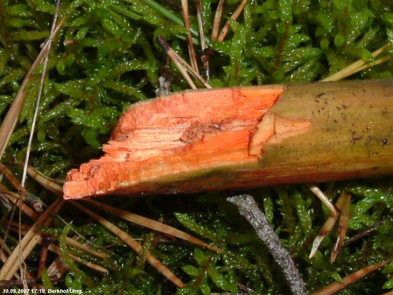 Hallo allerseits, ist das überhaupt ein Pilz? Ich sehe ein paar Parallelen zu Phanerochaete sanguinea, habe aber null Plan von dieser Materie. Niedersachsen, Berkhof/Umg., an Bruchstelle eines Kiefernzweiges, September 2007. Viele Grüße,