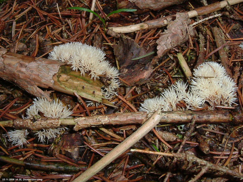 Hallo allerseits, diese ziemlich kleinen Gebilde habe ich unter Fichten im November 2006 bei Diekholzen/Niedersachsen gefunden. Während "unser Rotkehlchen" völlig betört um einen Volvariella surrecta-Fund tanzte, habe ich mich halt um die wichtigen Dinge gekümmert ;)