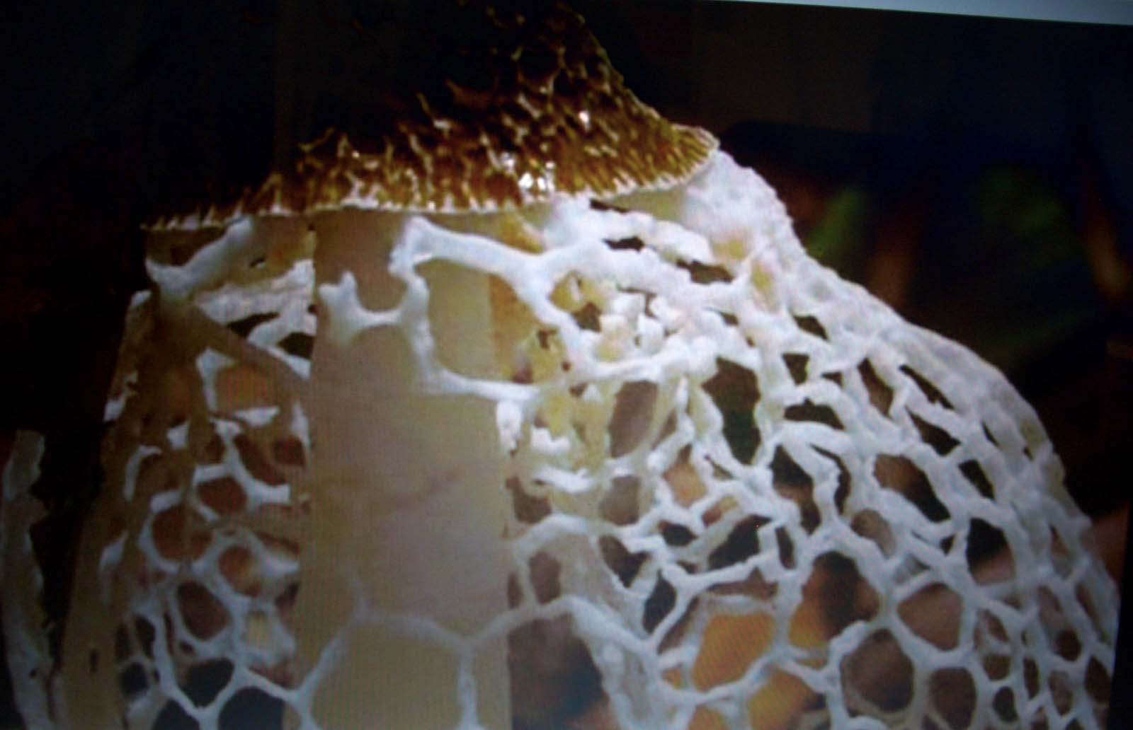 weiß jemand von euch wie der pilz heißt der in unsere erde-der film gezeigt wird? ihm wächst ein wabenartiges netz unter seinem hut hervor.