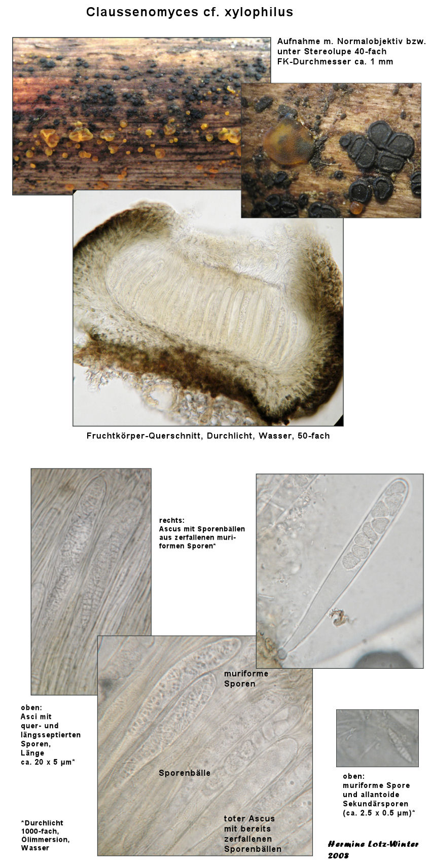 Hallo Ingo, Bingo, aber ich denke, dass ich eine andere Claussenomyces-Art hatte als Du. Nach der DVD von HO Baral habe ich Claussenomyces xylophilus bestimmt, und zwar wegen der allantoiden Konidiosporen in Kombination mit den muriformen Sporen.Übrigens waren meine Pilze auch alle ganz schwarz, auch wenn das nicht so viel aussagt, grünliche Töne sah ich erst im Mikro bei den Schnitten. Ich habe sicherheitshalber auch nochmal nachgefragt, aber in der Kürze der Zeit noch keine Antwort erhalten. Ganz nebenbei: ich habe noch nie vorher einen Claussenomyces gefunden, nur Tympanis auf Apfelbaum, daher war ich ganz ordentlich begeistert! Viele Grüße Hermine