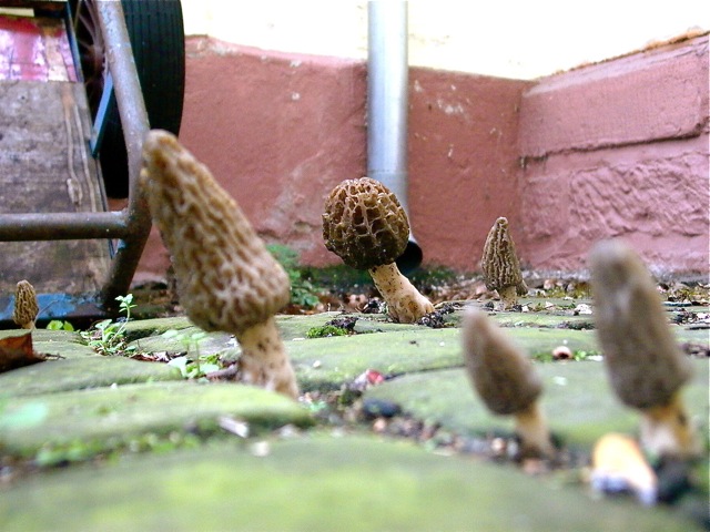 Diese schönen Morcheln waren eines Morgens Ende März in unserem Hinterhof, mitten in der Karlsruher Südstadt, gegenwärtig. Sie wachsen zwischen den Sandsteinpflastersteinen auf sandigem Terrain.