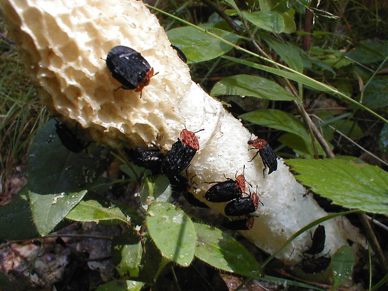beim myxo könnte es sich um ein junges stadium von arcyria cinerea handeln. der käfer dürfte der rothalsige aaskäfer (oeceoptoma thoracica) sein. ein liebhaber von stinkmorcheln :-)
