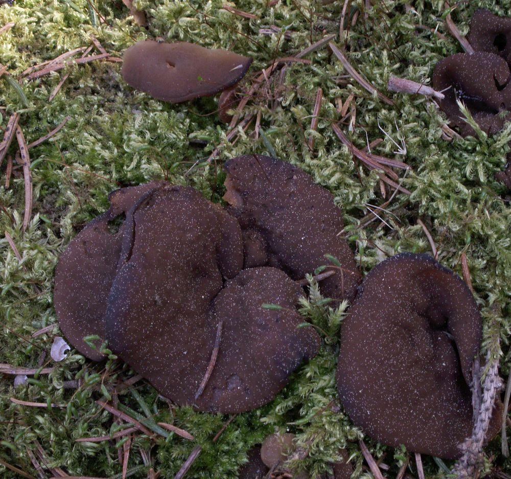 Guten Abend, diesen Pilz fand ich heute auf einem schon gut bemoosten Fichtenstubben (in Litauen). Nur auf einem, da aber zahlreich. Größe 2...5 cm. Auf dem Bild einer der Größeren, oben eine Unterseite. Ohne Stiel; läßt sich gut kauen, aber ohne spezifischen Geschmack & Geruch.