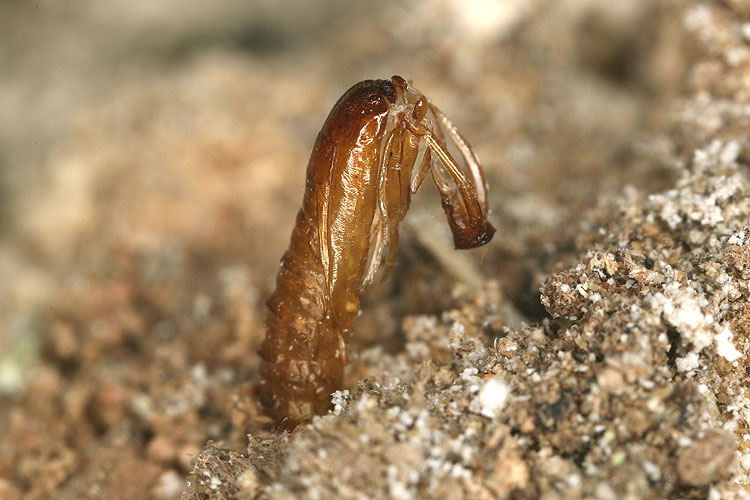Die Raupen leben im Innern des Pilzes und verpuppen sich auch da, nachdem sie ein Schlupfloch vorbereitet haben, das verdeckelt und von aussen nicht sichtbar ist. Vor dem Schlüpfen durchbricht die Puppe den vorbereiteten Verschluss und entlässt den Falter. Im Bild die übrig gebliebene Puppenhülle. Daten zu den Bildern: Schweiz, Bern, Gaicht, 800msm; Buchen-Mischwald in steiler Südhanglage über Kalk; 1. April 2008; Raupen in alten Stockpilzen; Falter geschlüpft am 11. Mai 2008. Besten Dank für die Hilfe und eine schöne Woche wünscht Ruedi