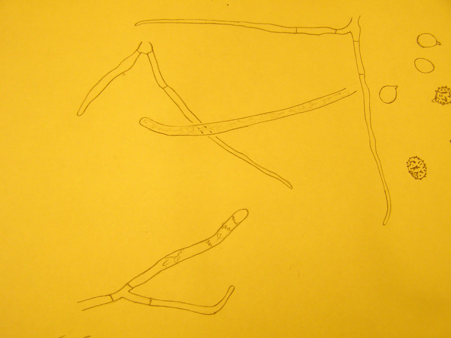 Hallo Ursula, gibst Du Dich auch mit einer Zeichnung von mir zufrieden? Sie ist vom ersten Pilz. Alle Kollektionen wurden mehrminder ausführlich dokumentiert. Erstens ist die Huthaut immer ein ziemlicher Brei mit schmalen, oft ziemlich langen Haaren und sehr undeutlichen Zystiden (sie schwärzen in SV sehr selten und widerwillig). Zweitens sehen die Sporen aus wie dargestellt, variieren aber auch von Kollektion zu Kollektion etwas in Größe und Ausprägung des Ornamentes. Bei aller Variabilität überwiegen die Gemeinsamkeiten. Sorgen macht mir eher das Makroskopische (Farbvariation der Frk, gewisse Variabilität der Spp-Farbe). Alles Gute, Jochen.