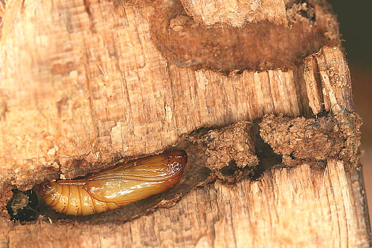 Das erste Bild zeigt Bohrgänge, welche die Raupe im toten Holz angelegt hat. In einem dieser Gänge ruht jetzt die Puppe. Die Schlupföffnung ist mit einer doppelt angelegten, gegen aussen aufgehenden "Gespinst- und Genagseltüre" gesichert, welche der frisch geschlüpfte Falter dann aufstossen wird. Zur Anfertigung der Aufnahme wurde das befallene Holz vorsichtig gespalten, damit der Bohrgang zum Vorschein kam. Nach dem Fotografieren wurden die beiden Holzteile wieder verschlossen und mit Faden zugebunden. Ruedi