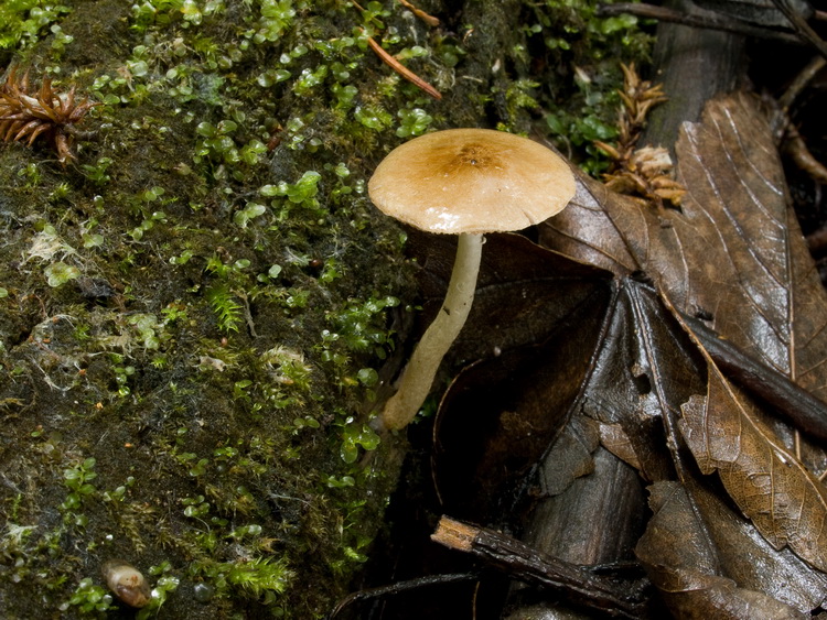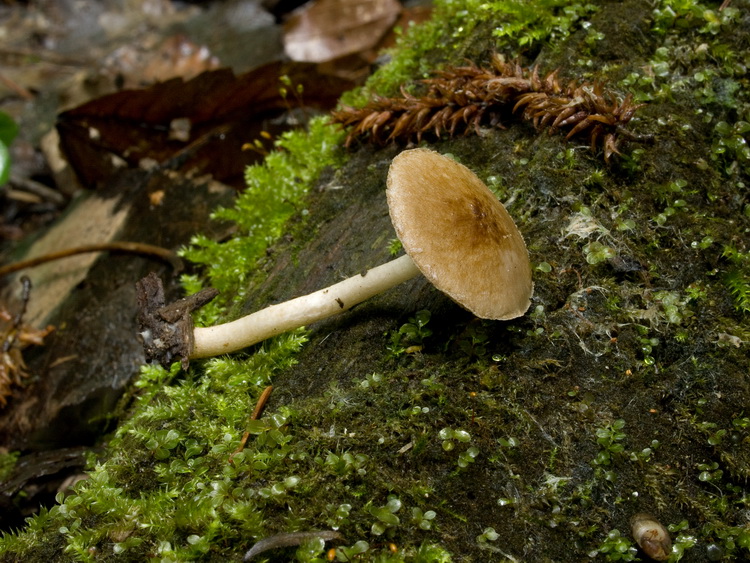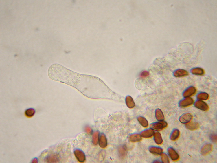 Funddaten: 06.06.2008; MTB 7934-4-4-4, 550 m, Baierbrunn, im Auwald; nur wenige Meter vom Ufer auf morschem Laubholzstammstück (vermutlich Erle); einzeln; Hut: 2,5 cm breit, ohne Buckel, ziemlich filzig (wohl durch dickes braunes Velum), am Scheitel leicht schuppig aufgebrochen, zum Rand hin stellenweiße silbrig bereift (schwach), graubraun bis olivbraun; Stiel: 4 x 0,3, zylindrisch, hohl, basal gleichdick, weißlich, schwach überfasert, Überfaserung im unteren Stielbereich bräunlich, schwach gänzend; Lamellen: schmal angewachsen, gedrängt, untermischt, bauchig, reif lilabraun, Schneiden fein weißflockig; Fleisch: im Hut wässerig graubraun, im Stiel cremefarben; Geruch: neutral; Geschmack: -; Cheilozystiden: mäßig dicht stehend, vorwiegend utriform und meist kopfig (auch spindelig-bauchig), Maße (LängexBauchxKopf) 27-47 x 10-13 x 5-8, vermischt mit keulig-blasigen Parazystiden; Schnallen vorhanden; Pleurozystiden: geformt wie die Cheilos, z.B. 51 x 12,5 x 9; Kaulozystiden: -; HDS: HDS zellig, von sehr reichlichem, vakuolär braun bis goldbraun pigmentiertem Velum überlagert; Velumzellen z.B. 50x12, 35x7 (+/-zylindrisch); blasige HDS-Zellen bis 30-40 µm breit; Basidien: 4-sporig, keulig, 18-21 x 7,5-8; Sporen: dickwandig, im Profil bohnenförmig mit auffallender, aprupter suprahilärer Depression direkt unterm Apiculus, in der Aufsicht ovoid bis "kartoffelsackförmig", meist mit breit abgesutzer Apiculusseite; Kp. ca. 1,5 breit, zentral; Maße: in der Aufsicht etwas breiter (bis 5) als im Profil (bis 4-4,5), 7,6 x 4,6 (7-8 x 4-5);