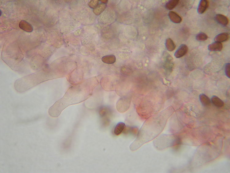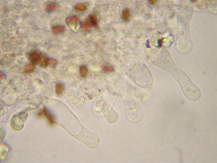 Das auffallendste Merkmal sieht man am besten auf dem letzten Foto: der Hut ist braunfilzig überzogen. Wenn ich die Geschichte mikroskopisch richtig interpretiere, dann handelt es sich dabei um ein dickes Velum aus vorwiegend zylindrischen Zellen, die vakuolär goldbraun pigmentiert sind.