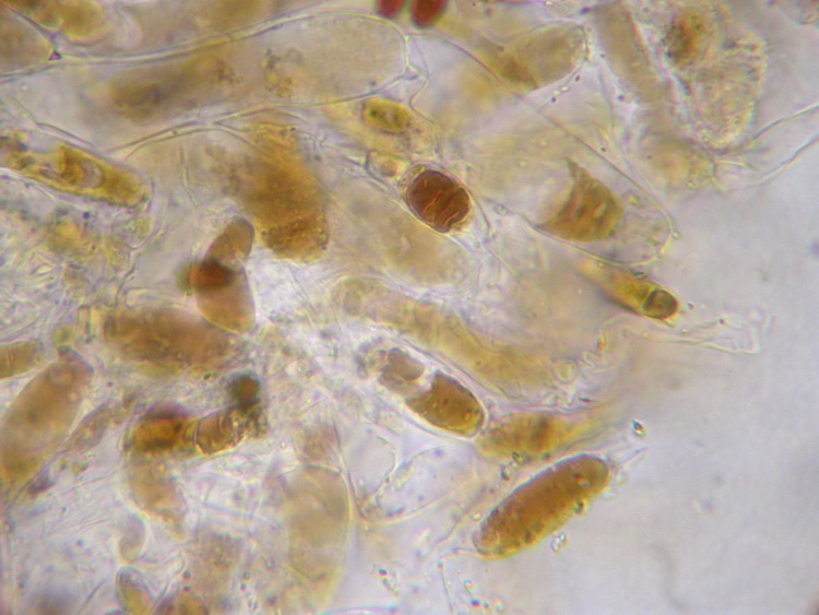 Die Sporen sind ziemlich klein (7,6 x 4,6) , im Profil meist bohnenförmig, in der Aufsicht "kartoffelsackförmig" und etwas breiter;